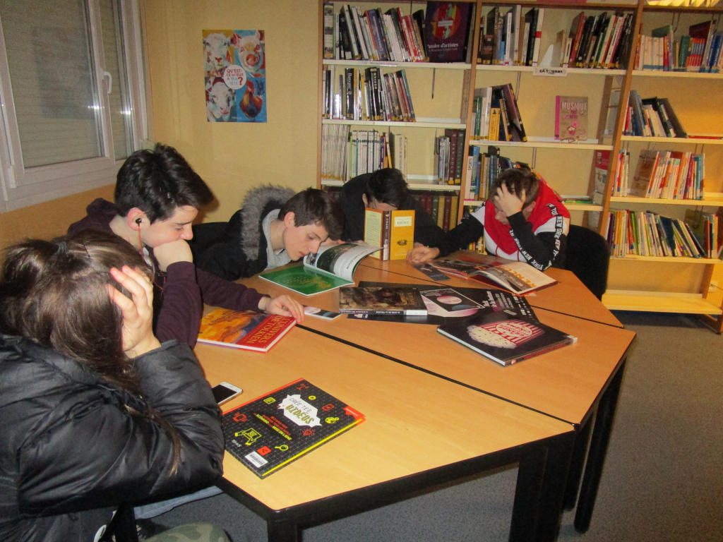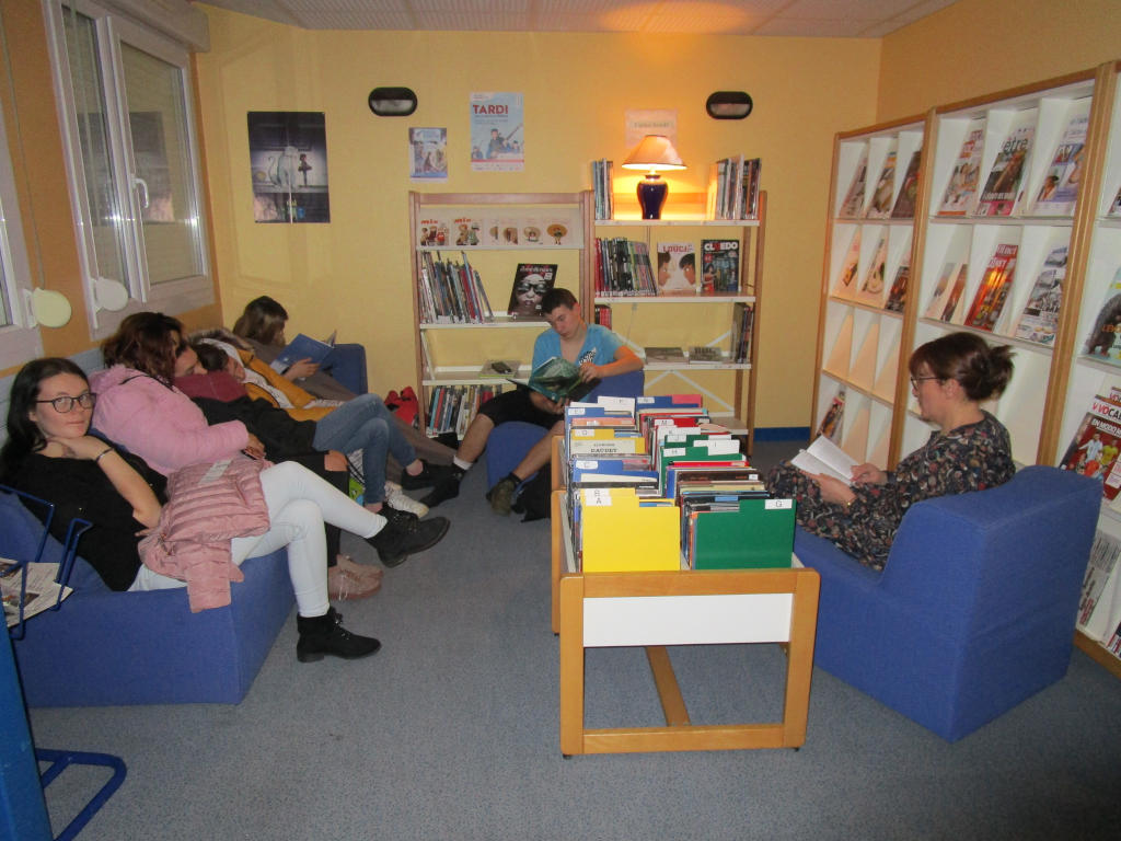 Le jeudi 17 janvier de 19h30 à 20h30, le CDI a organisé pour la première fois une Nuit de la Lecture à destination des élèves internes. Cette action s'inscrivait dans le cadre du dispositif national du même nom https://nuitdelalecture.culture.gouv.fr/ . Différents ateliers ont été proposés aux trente élèves participants : un atelier de lecture à voix haute où Mme André, Proviseure de l'établissement a lu pendant une heure différentes histoires aux élèves présents ; un atelier de créations en papier pendant lequel les lycéens ont créé des hérissons à partir de vieux livres mis au pilon ; un atelier "jeux littéraires" type cadavres exquis ; un atelier "je lis dans le noir" avec livres phosphorescents, lumières tamisées et transparents collés sur fond noir à la manière de la collection "lampe magique" de Gallimard. Les internes pouvaient participer aux ateliers de leur choix ou tout simplement lire dans leur coin.